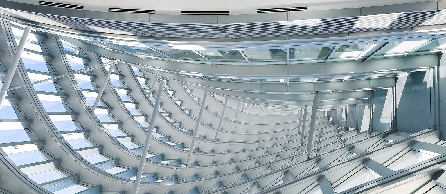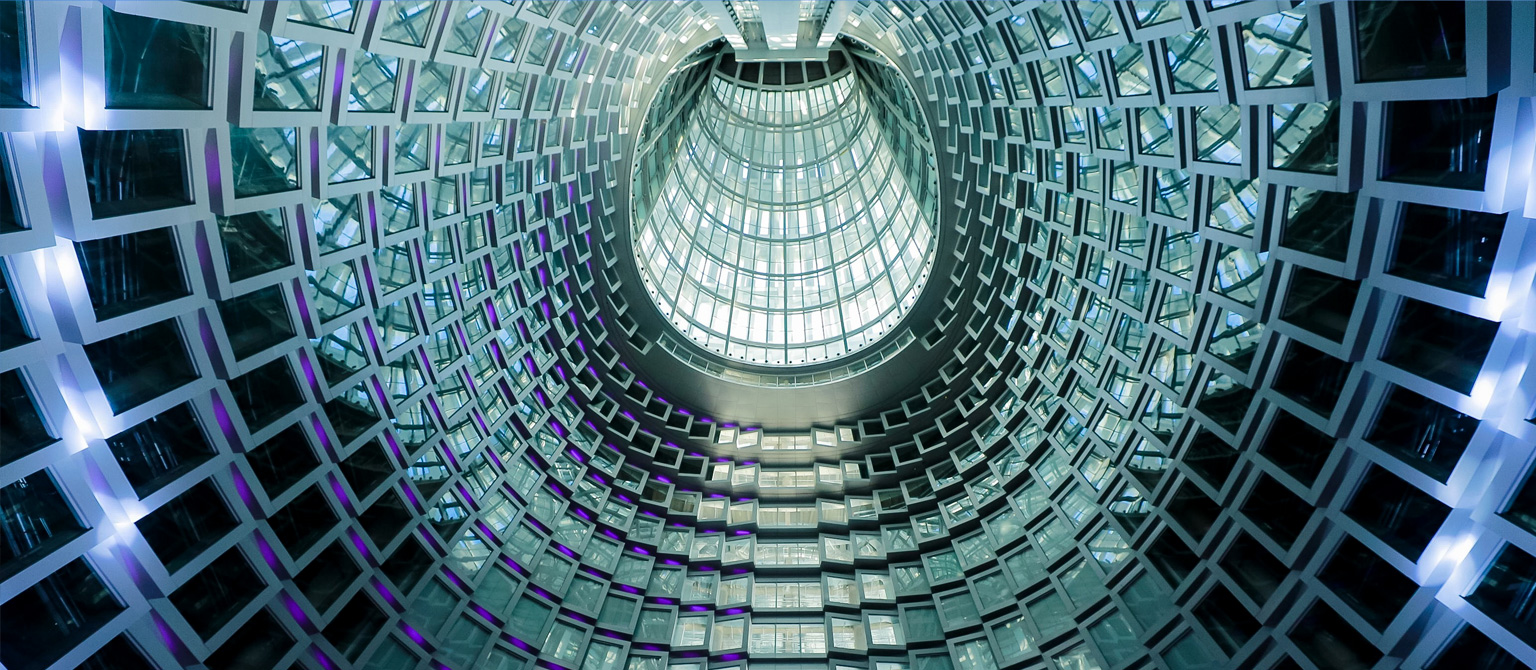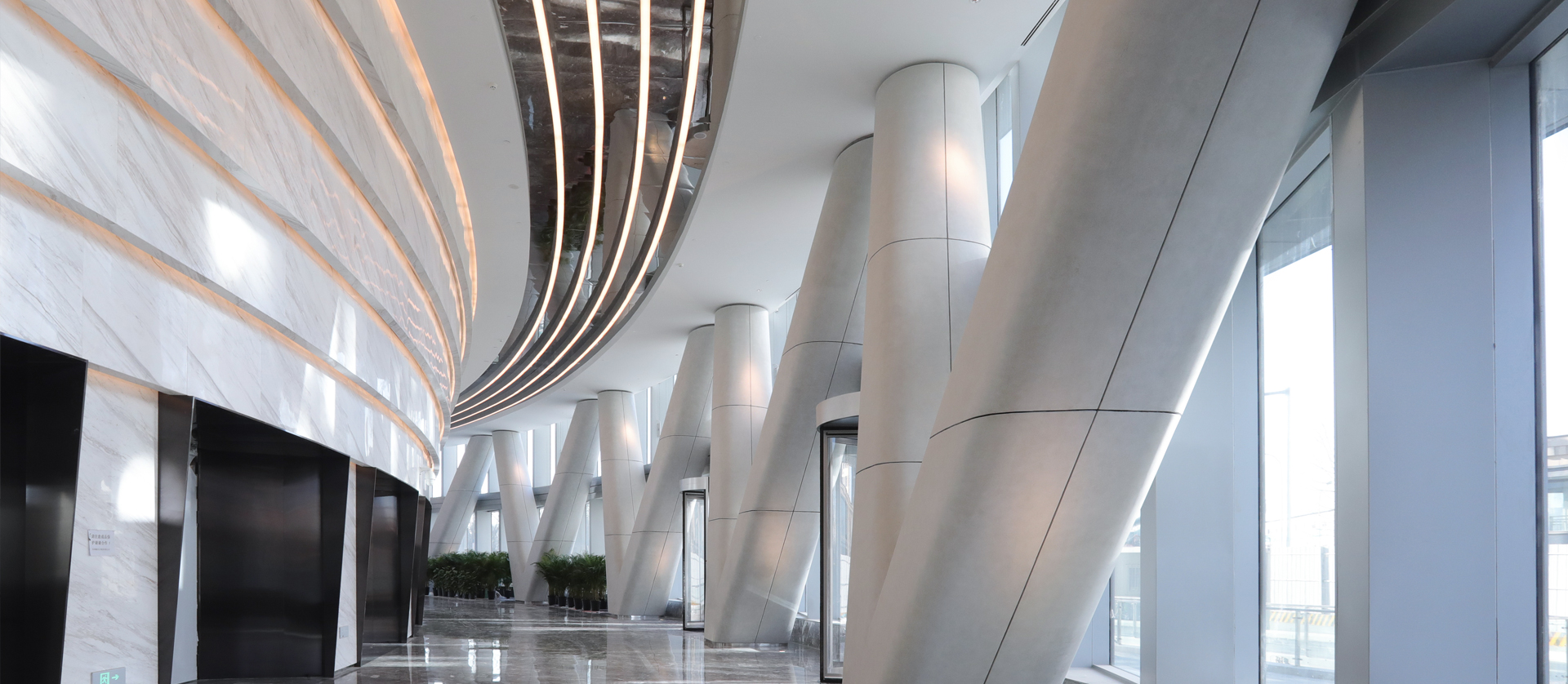 由于位于環(huán)形軸線上的地下柱子已經(jīng)建成,為了實現(xiàn)與放射軸線控制的地上外幕墻柱的連接,在首二層采用V柱進行轉(zhuǎn)換,將地下結(jié)構(gòu)通過極具表現(xiàn)力的手法轉(zhuǎn)換到樓上結(jié)構(gòu),同時符合結(jié)構(gòu)受力特性。屋頂Y柱作為外幕墻柱在穹頂?shù)难由?,同時也具備重要的視覺需求。為了降低截面尺寸,設(shè)計將其模擬樹形分叉,在頂部收攏到一個圓環(huán)。內(nèi)穹頂結(jié)構(gòu)也沿放射軸線向中心匯聚到核心筒,最終與外穹頂網(wǎng)架聯(lián)系在一起,形成了非常穩(wěn)定的雙層穹頂結(jié)構(gòu)。