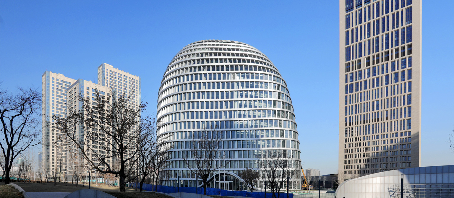 本項目位于一個規(guī)模超過10公頃的開放綠地之上,為了充分融入環(huán)境,并利用周邊的景觀文化資源,建筑通過柔和圓潤自由的空間形態(tài)實現(xiàn)與周邊道路和建筑的和諧對話。機動車由用地東側(cè)進出,用地內(nèi)設(shè)車行環(huán)路。地下車庫設(shè)置1組雙行坡道出入口,位于用地北側(cè),其他地庫出口與奧體南區(qū)地下公共空間項目共用。建筑東北角為辦公主入口,北側(cè)、西南及南側(cè)為商業(yè)主入口。地下一層與奧南地下公共空間相連,有通道連接周邊各個地塊及地鐵站。